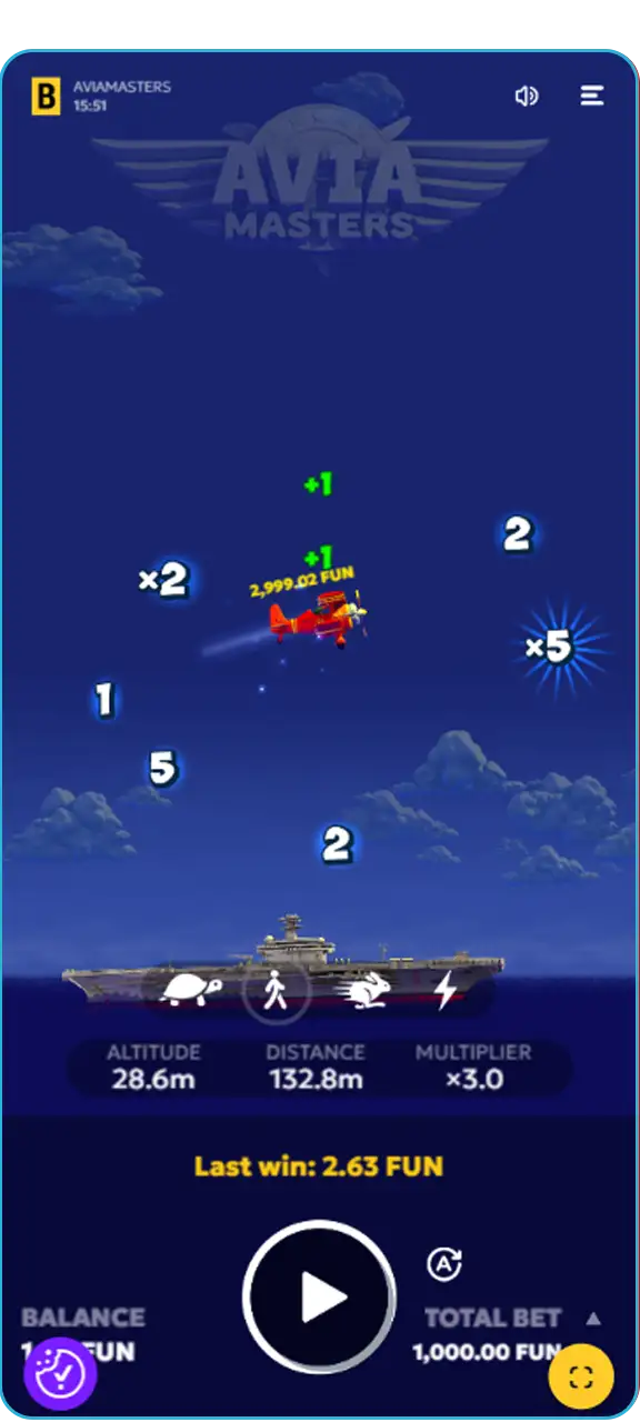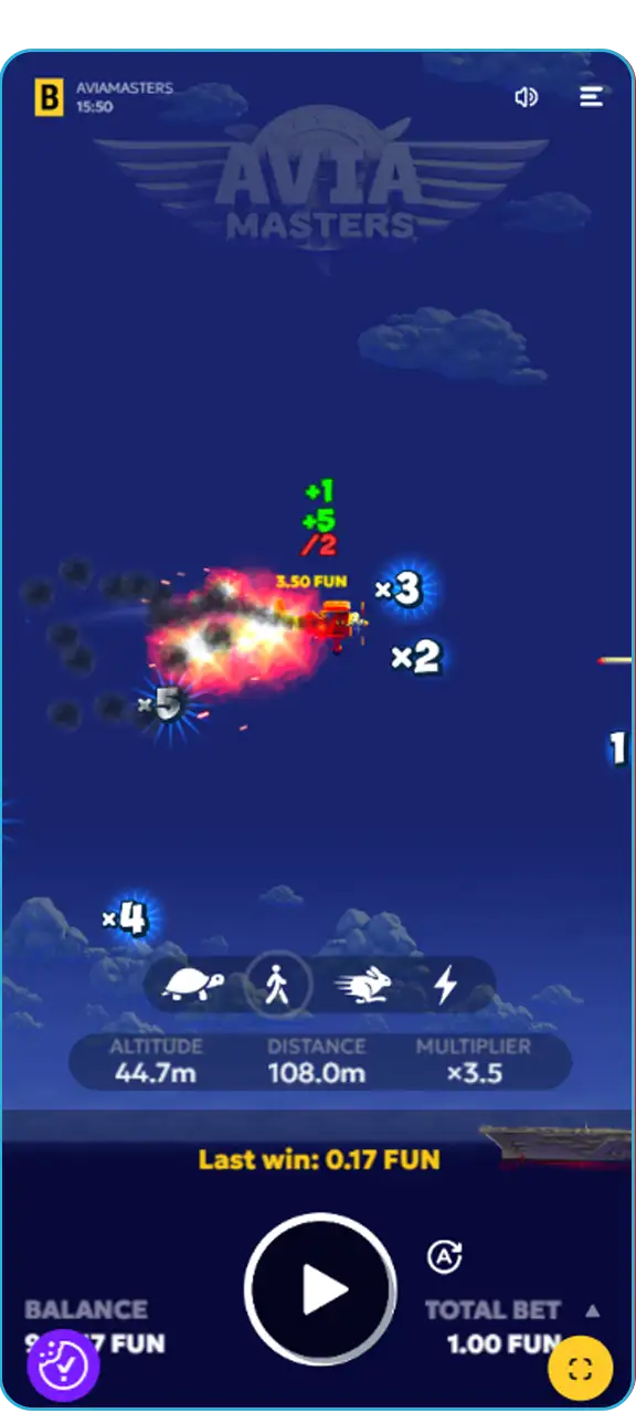 Das Spielprinzip von Avia Masters ist einfach, aber spannend und wiederholt sich in jeder Runde. Jeder Flug ist einzigartig – Ihr Ziel ist es, sicher durch den Himmel zu navigieren, Multiplikatoren zu sammeln und Hindernissen auszuweichen, bevor Sie sicher landen. Erfahren Sie mehr über die Funktionsweise des Spiels, seine Spielmechanik und seine nützlichen Features.