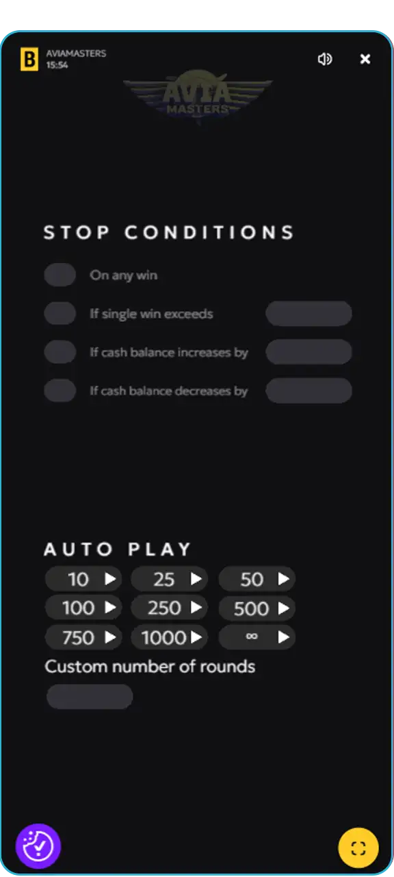 Avia Masters verfügt über ein Automatisches Abspielsystem, mit dem Sie mehrere Runden automatisch spielen können. Sie können außerdem Regeln für das Beenden festlegen – beispielsweise nach einer bestimmten Anzahl von Siegen oder Niederlagen.